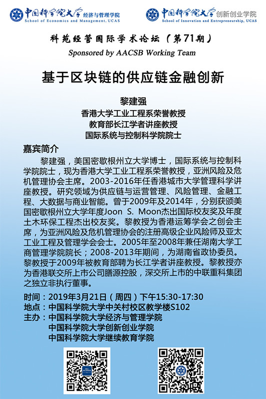 【科苑经管国际学术论坛】黎建强:基于区块链的供应链金融创新(3月21日)