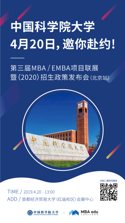 为帮助考生与院校间搭建透明、互信、深入了解的交流平台,打破区域的影响,实现项目共享,直面院校知真相。 中国MBA教育网于4月20日,联合北京、天津、上海、广州等地区知名商学院,举办第三届MBA项目联展暨2020招生政策发布会(北京),为使全国考生更全面、更及时的了解中国科学院大学MBA项目,掌握MBA最新资讯,中国科学院大学MBA教育管理中心将应邀出席。欢迎广大考生报名,现场咨询中国科学院大学MBA项目。
