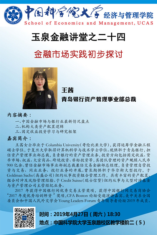 嘉宾简介:王茜女士毕业于Columbia University(哥伦比亚大学),获得运筹学金融工程硕士学位,于复旦大学取得计算机科学与技术学士学位。现供职于青岛银行,担任资产管理事业部总裁,负责银行的资产管理业务,投资方向包括固定收益、货币市场、权益、大宗商品、跨境投资、非标投资等,其团队管理的资产规模人民币900亿余。曾任金融市场事业部副总裁兼任交易金融部总经理,负责管理自营投资与交易、同业业务、投行业务的开展。曾长期供职于华尔街大型投行,于Goldman Sachs(高盛公司)纽约从事投资组合管理工作,具有丰富的资产配置、组合对冲及风险管理经验。于Credit Suisse(瑞士信贷)纽约从事与大型对冲基金与资产管理公司主营经纪业务。2017年获得中国银行间优秀交易主管奖项,获得中国银行间交易商协会“2017年度优秀培训师资”奖项,CFA Boston论坛受邀演讲嘉宾,美中关系全国委员会和中国人民外交学会Young Leaders Forum青年领导者论坛2019年成员。