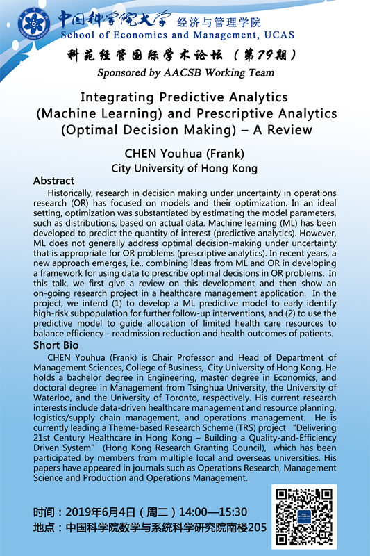 报告摘要:Historically, research in decision making under uncertainty in operations research (OR) has focused on models and their optimization. In an ideal setting, optimization was substantiated by estimating the model parameters, such as distributions, based on actual data. Machine learning (ML) has been developed to predict the quantity of interest (predictive analytics). However, ML does not generally address optimal decision-making under uncertainty that is appropriate for OR problems (prescriptive analytics). In recent years, a new approach emerges, i.e., combining ideas from ML and OR in developing a framework for using data to prescribe optimal decisions in OR problems. In this talk, we first give a review on this development and then show an on-going research project in a healthcare management application. In the project, we intend (1) to develop a ML predictive model to early identify high-risk subpopulation for further follow-up interventions, and (2) to use the predictive model to guide allocation of limited health care resources to balance efficiency - readmission reduction and health outcomes of patients.