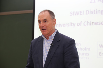 2019年4月21日晚,由中国科学院大学经济与管理学院主办,中国科学院大学继续教育学院(培训中心)承办的“思危大讲堂”第24讲在中关村校区举行。麻省理工学院和圣塔菲研究院的校董John Chisholm先生应邀做题为“人工智能的发展及其对创新生态系统的影响(The Evolution of, and Impact of AI on, Innovation Ecosystems)”的讲座。中国科学院大学中丹学院院长、经济与管理学院教授赵红主持讲座,对远道而来的Chisholm先生表示热烈欢迎。中国科学院大学继续教育学院副院长孙毅及培训中心副主任王娟出席本次活动。